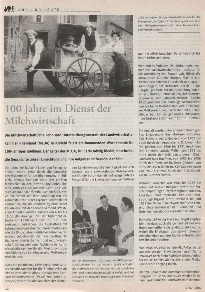 - 2002, 100 Jahre MLVA / MLUA Krefeld, Deutsche Milchwirtschaft; 53 Jg., 2002, Heft 18, S. 776 bis 779