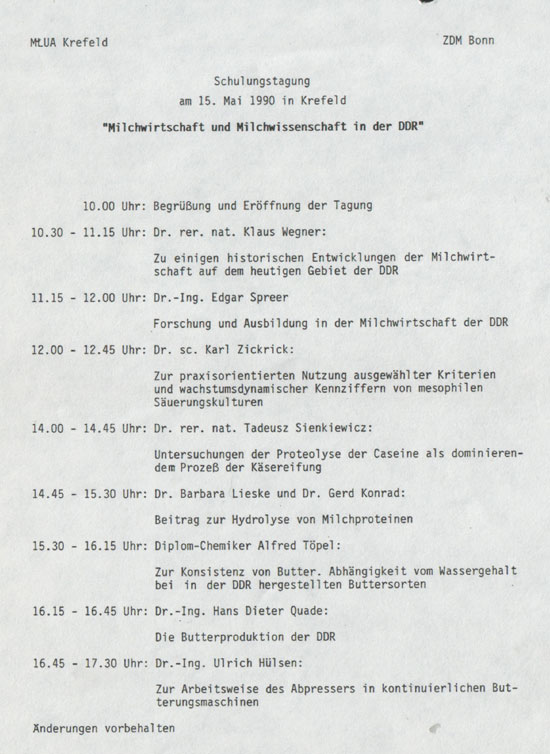 - 1990, Milchwirtschaft und Milchwissenschaft in der DDR - MLUA Krefeld: Informationstagung am 15..06.1990